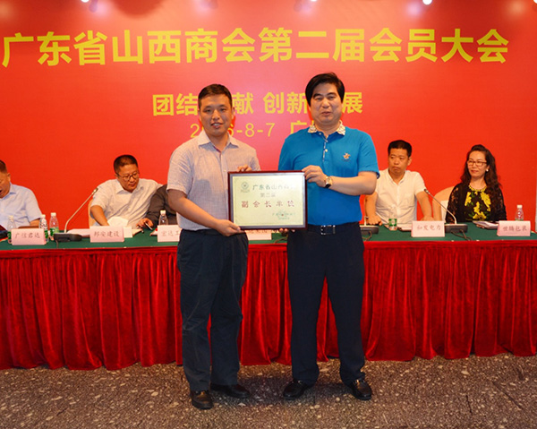 2016年8月7日,杨永岗(前排左)当选广东省山西商会副会长,会长远勤山授牌。