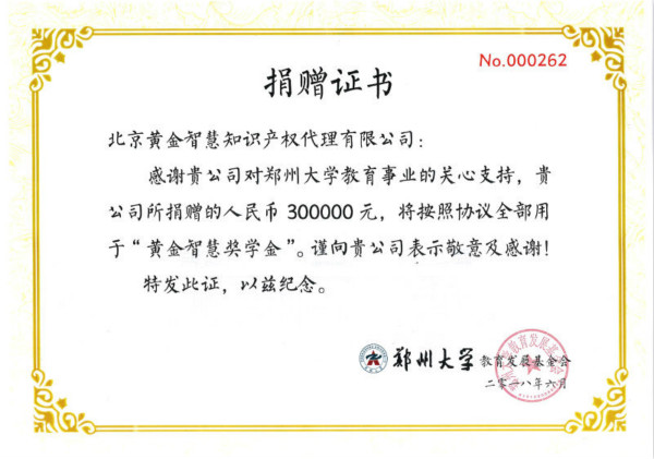 郑州大学“黄金智慧奖学金”捐赠证书(30万人民币)