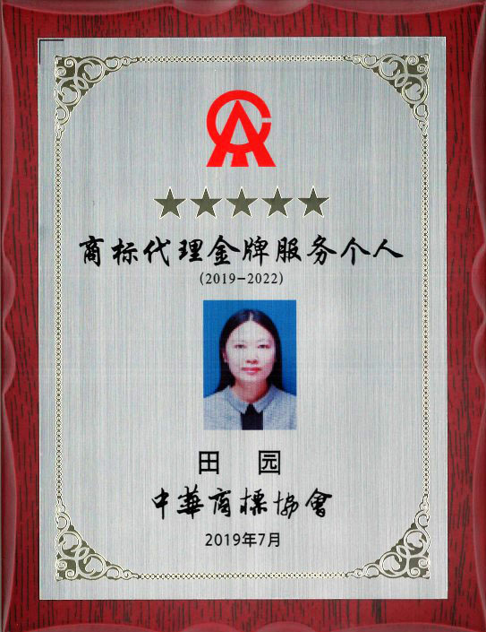 首批五星级商标代理金牌服务个人-田园(2019-2022)